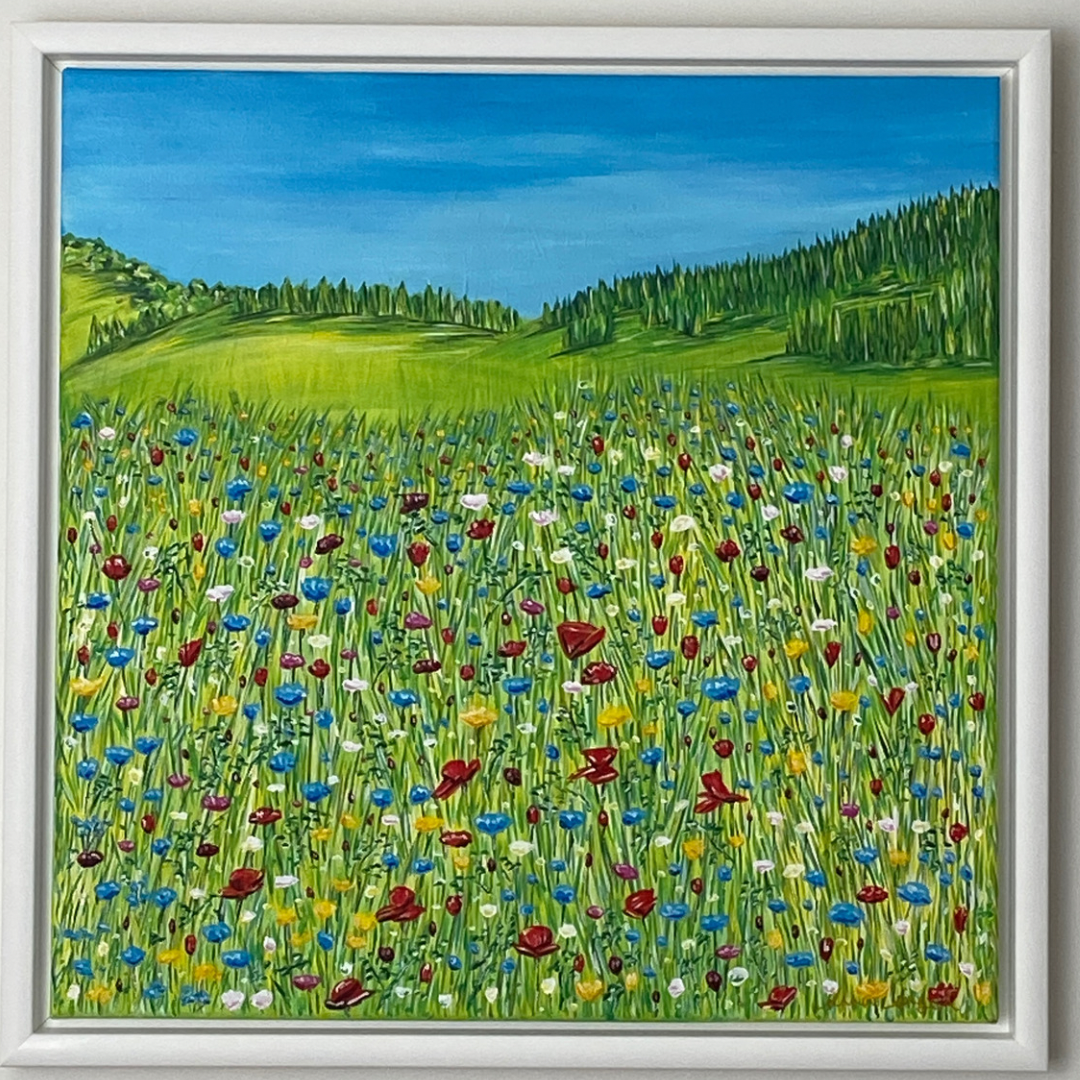 Simon’s says “My style in art is for working in bright colours (because they make me happy!), using acrylics and mixed media. Collage elements are sometimes used to help with form and for creating a semi-abstract loose style. Deliberately not adding too much detail, hopefully the viewer will enjoy the composition for it’s vibrant colour and form.”